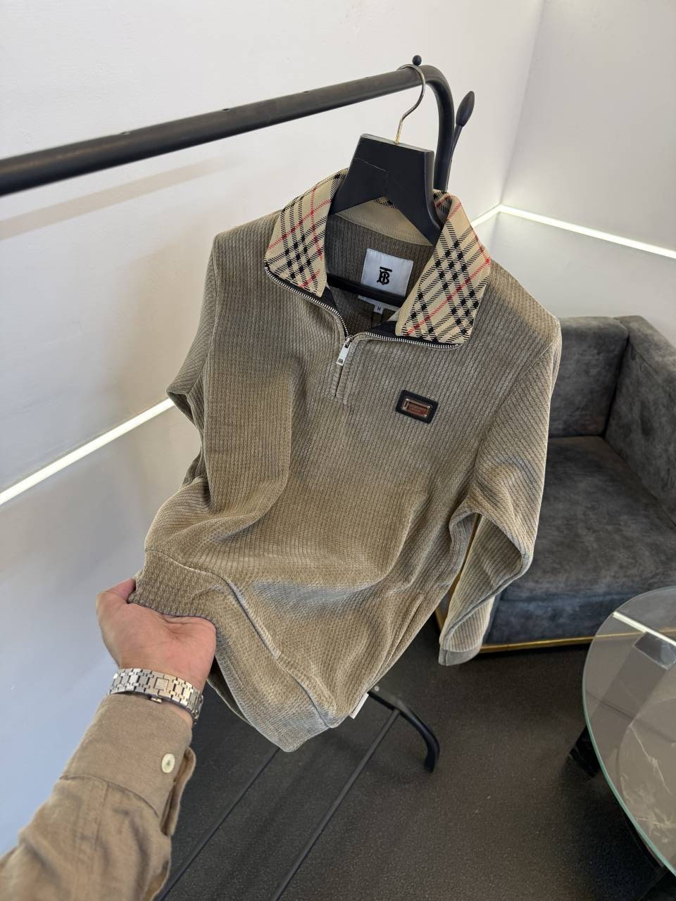 Burberr y woollen knitted blend imported sweatshirt with steel logo on chest and brand zip cream