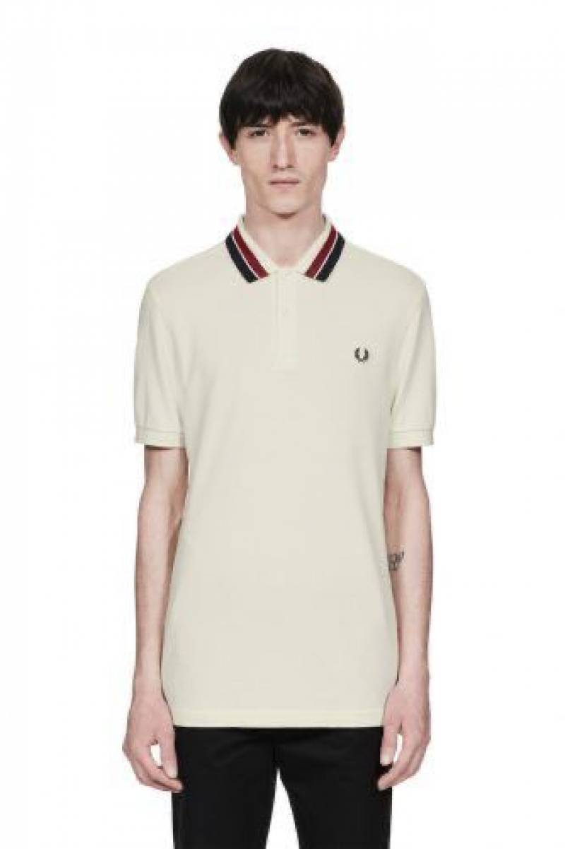 Fred Perr y White Premium Cotton Pique fabric Polo Tshirt with Shoulder Design and Embroidered Logo 3784
