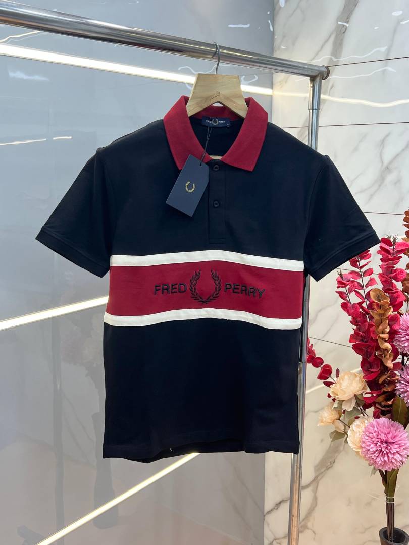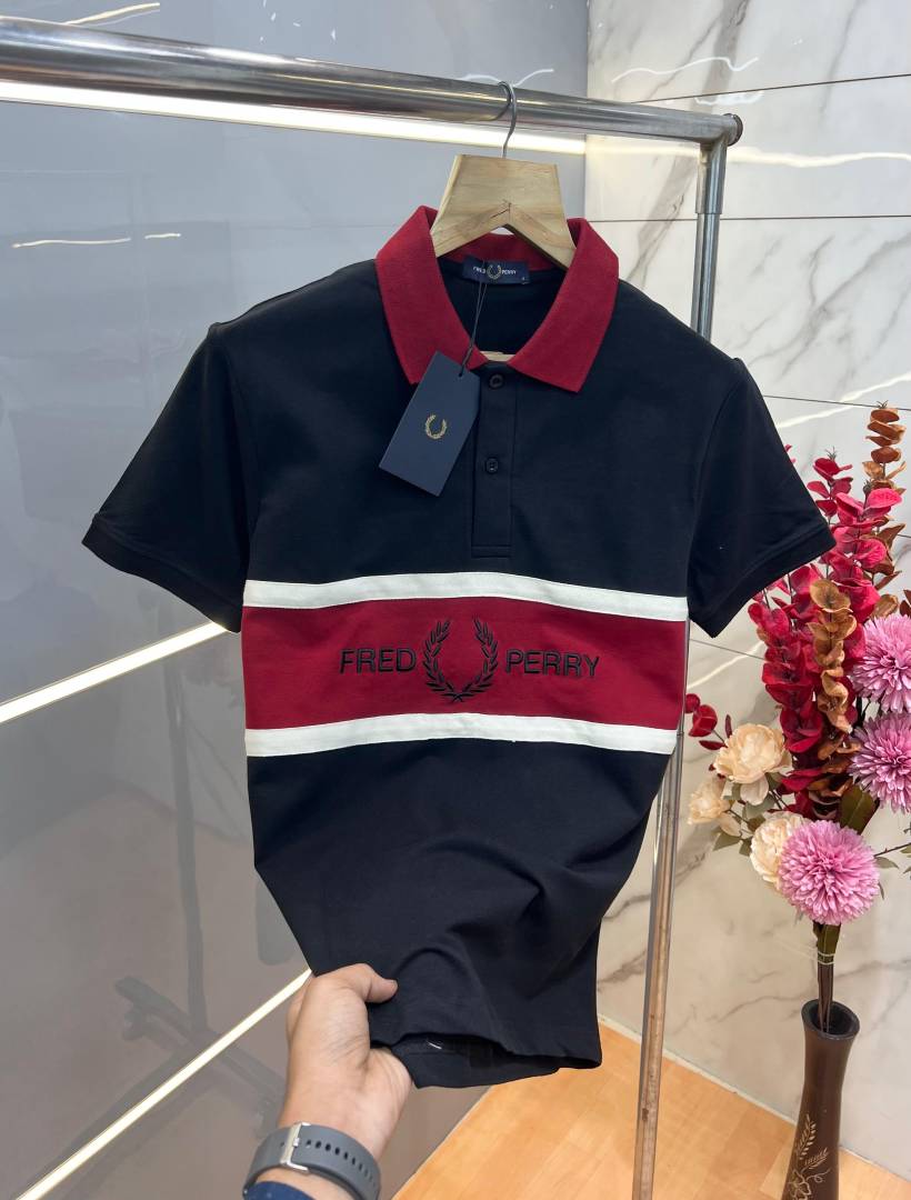 Fred Perr y Black Premium Cotton Pique fabric Polo Tshirt with Front Design and Embroidered Logo 3787