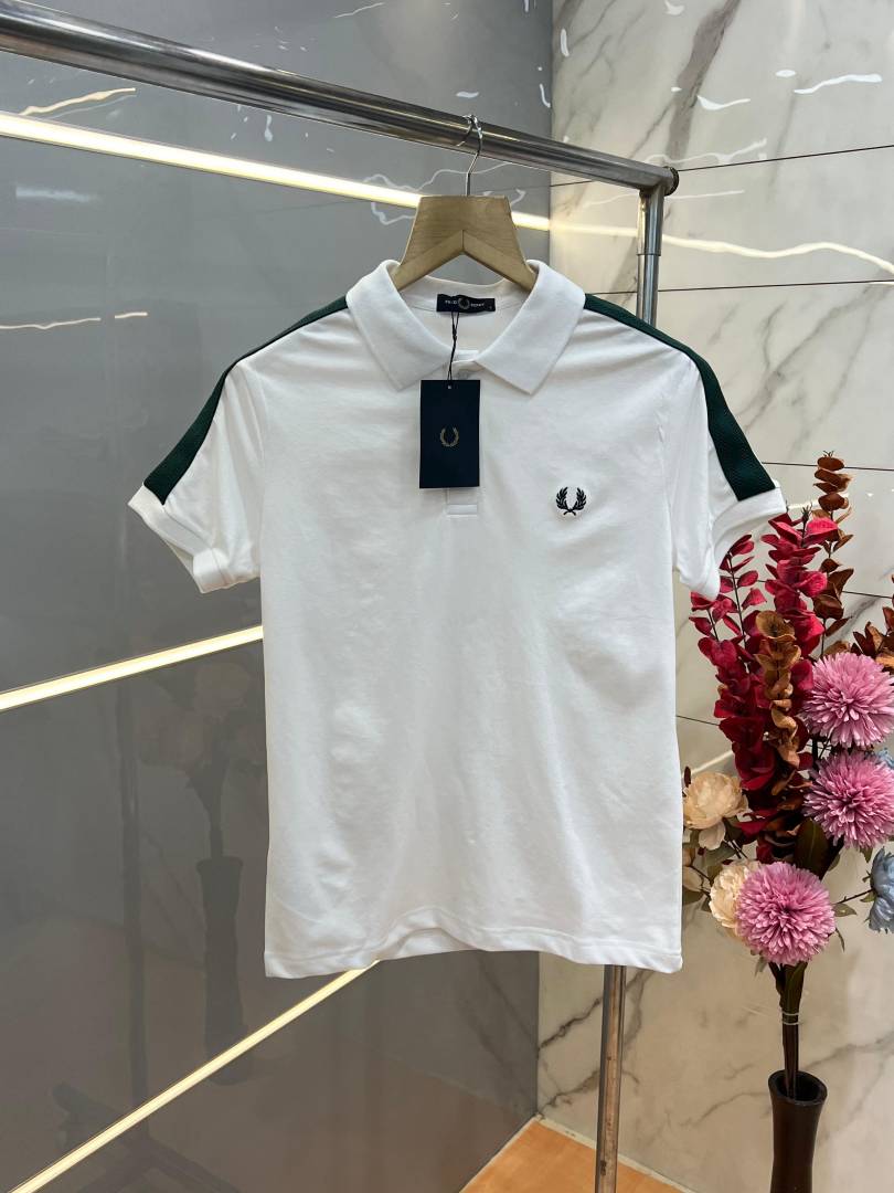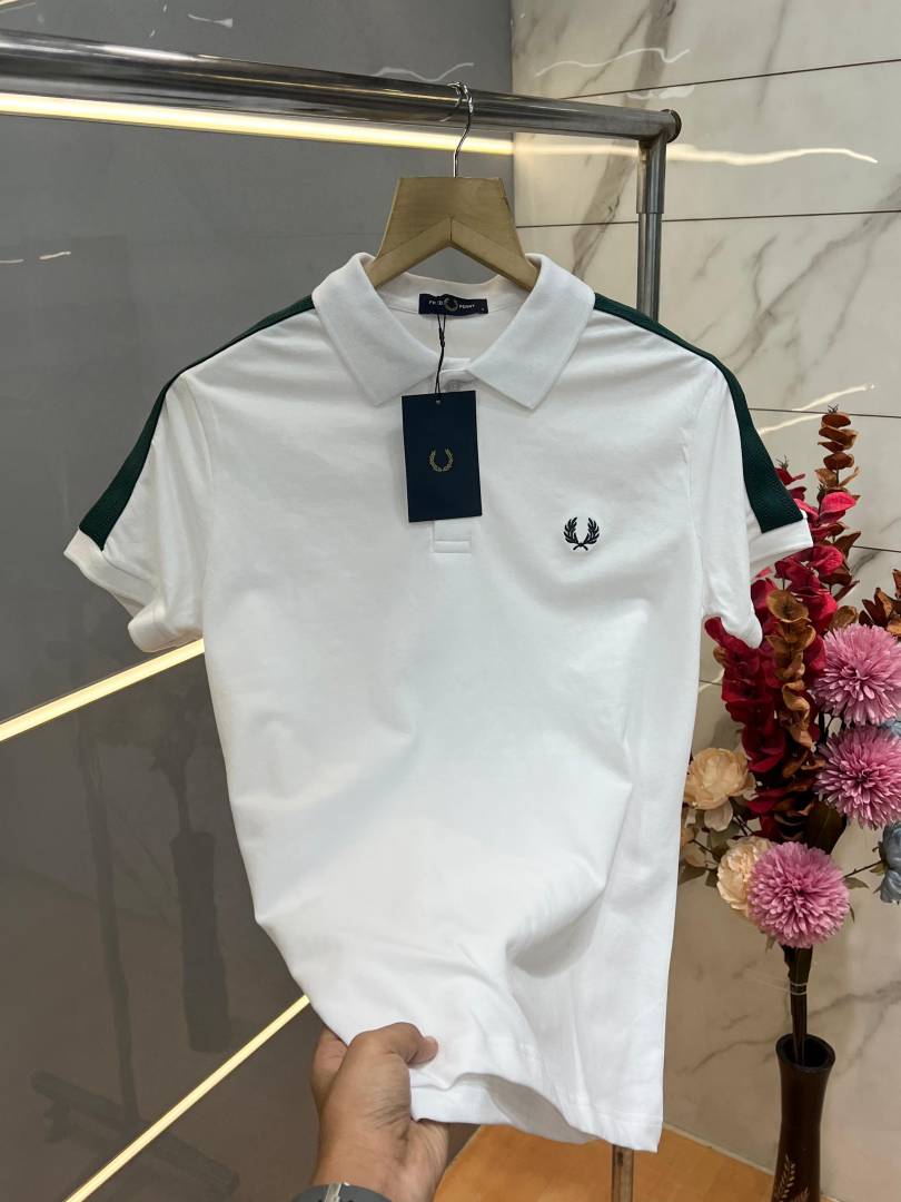 Fred Perr y White Premium Cotton Pique fabric Polo Tshirt with Shoulder Design and Embroidered Logo 3784