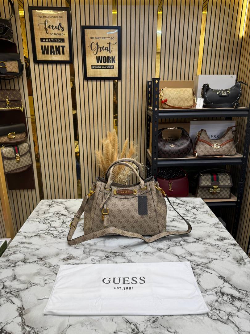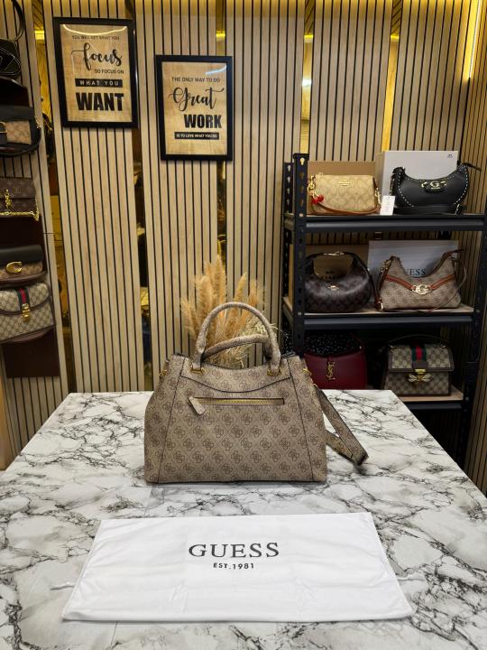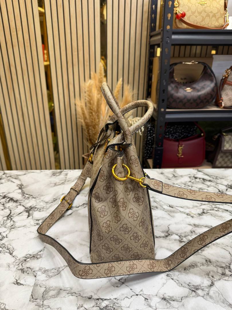Guess Emera Logo Satchel Monogram Hand Bag With Dust Bag (Coffee)