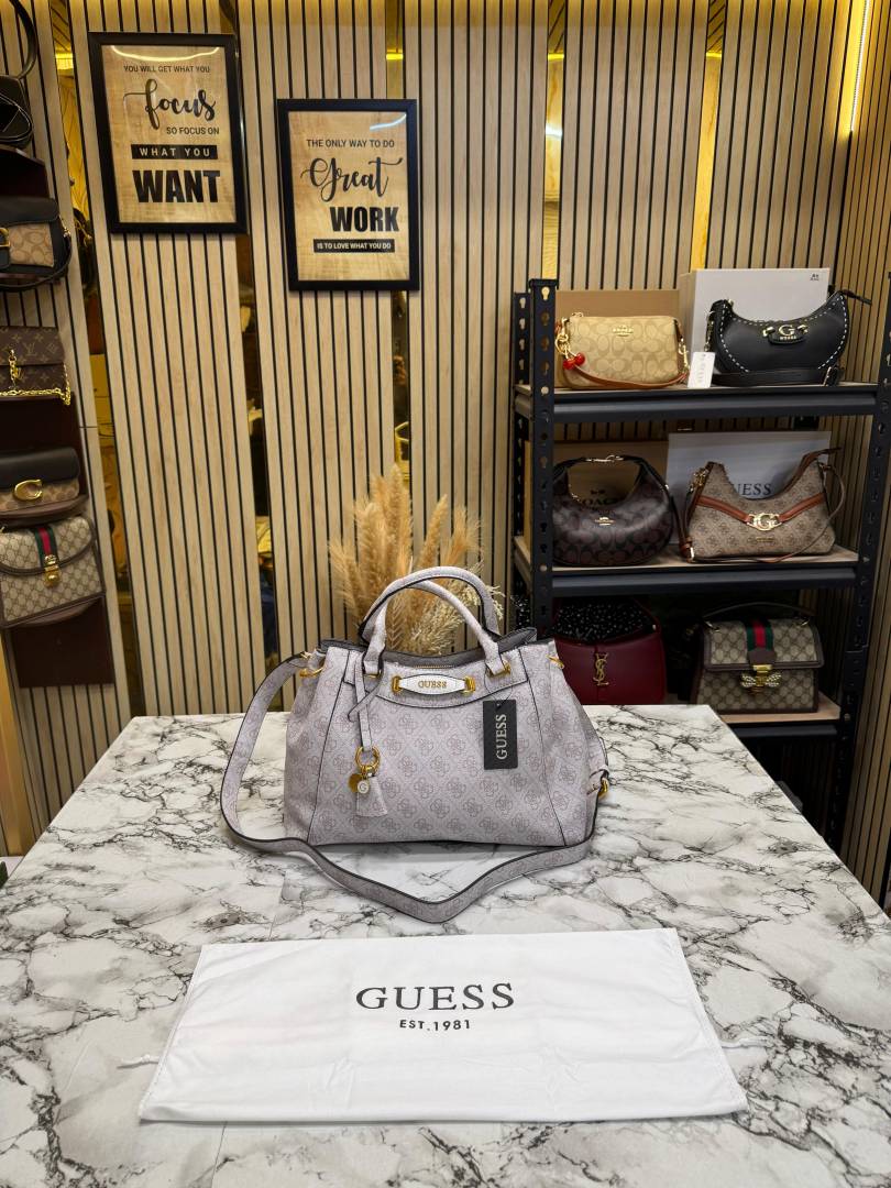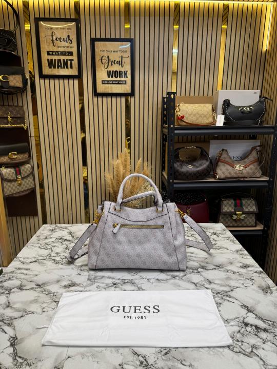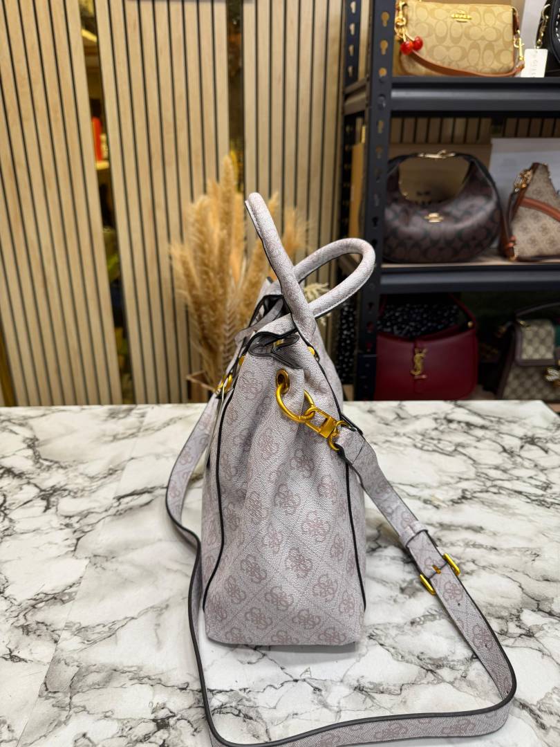 • Guess Emera Logo Satchel Monogram Hand Bag With Dust Bag (Grey)