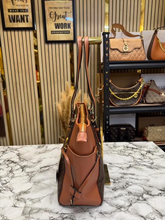 Guess Emera Logo Satchel Monogram Hand Bag With Dust Bag (Brown)